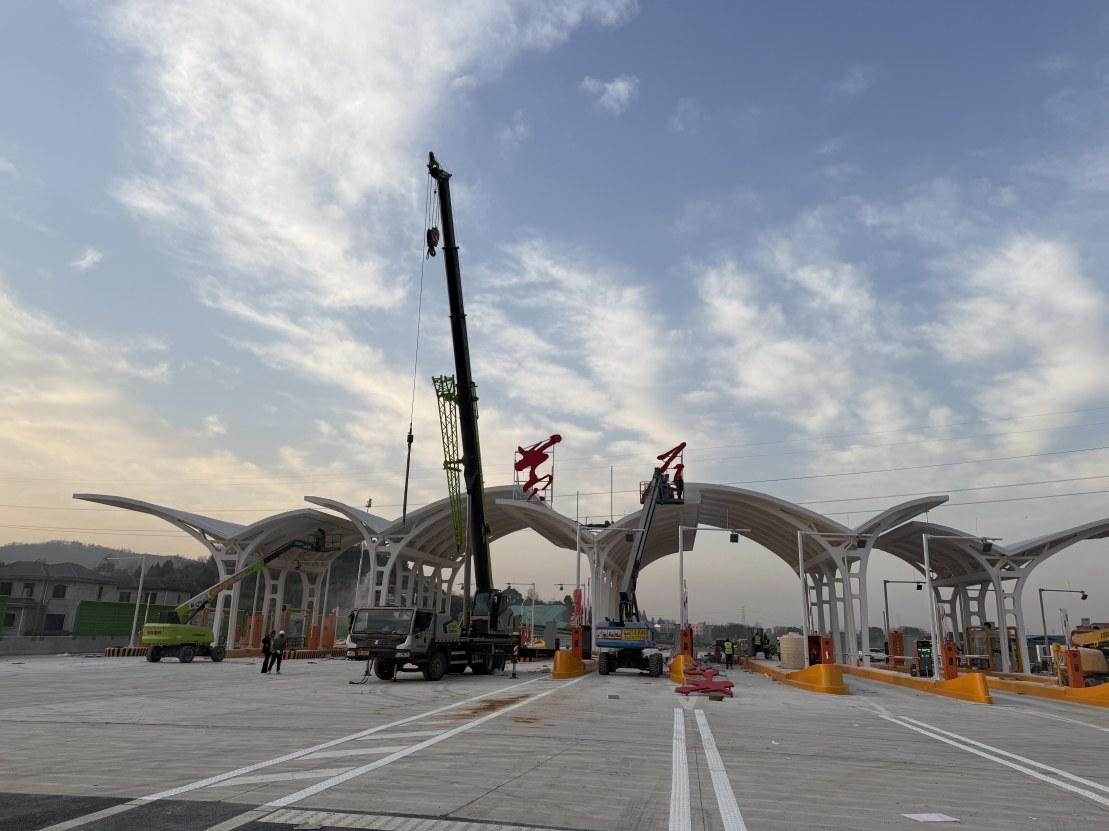17日下午,记者来到大广高速东方山互通工程项目施工现场看到,该收费站已经基本建成。该收费站的天棚采用空间网架结构,建设者们正在天棚中间位置上安装“黄石”两个字。