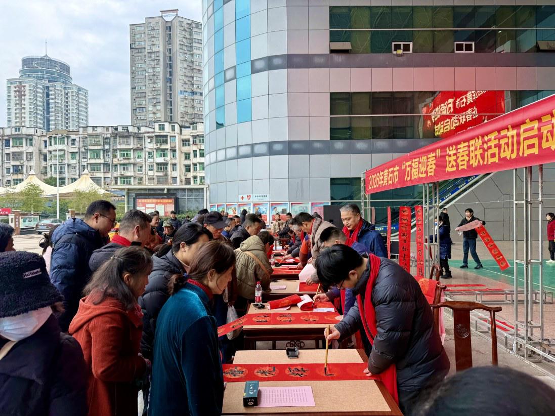 25日上午,2026年黄石市“万福迎春”送春联活动在市工人文化宫广场举行。活动由黄石市工人文化宫、市书法家协会联合主办,中煤湖北地质勘察基础工程有限公司协办,旨在弘扬中华优秀传统文化,营造欢乐祥和的春节氛围,满足市民群众节日文化需求。