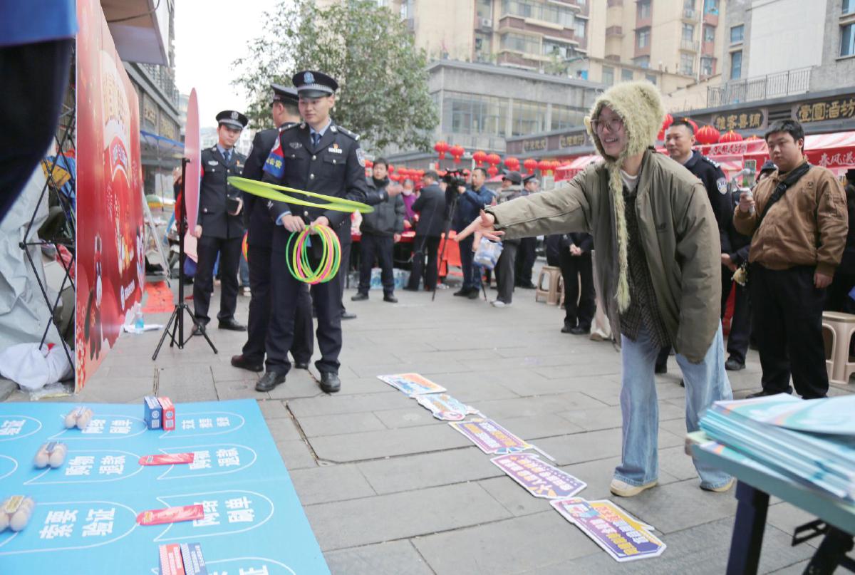 当天下午2时,活动正式开始。民警们支起的“年货摊”前很快围满了人。在反诈大转盘区域,市民纷纷扫码关注警方微信公众号,并转发反诈公开信,随后转动转盘回答反诈问题。答对者即可获得套圈,参与下一轮游戏。