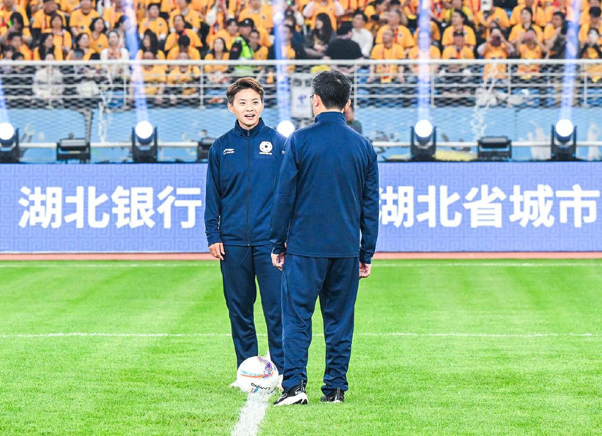 王霜的出现,瞬间点燃了全场的气氛。这位从荆楚大地走出的亚洲足球小姐,身穿运动服、气场十足。她微笑着向四周看台挥手致意,球迷们则用最热烈的掌声回应她。