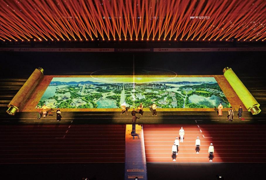当晚,黄石奥体中心华灯璀璨、人声鼎沸。赛前暖场环节,由“城市发展”“历史文化”“文明新城”“体育运动”四大主题方阵组成的NPC巡游队伍,进行了巡游展演,提前点燃现场气氛。随后的文艺表演,融合了时代、足球、文化、科技与地域五大特色。首篇舞蹈《熔铸》通过灯光秀、裸眼3D效果,营造山脉、铜草花、炉火等环境及场景元素,再融入舞蹈动作,呈现开山寻矿、冶炼铸鼎的劳动场景。第二章情景表演《相逢之山水有约》和《相逢之激情绿茵》兼具视觉震撼与文化厚度,以跨越时空的对话为情感脉络,让当代人物与张志和、苏东坡、张之洞等历史先贤隔空对话,诉说城市文脉传承、赓续地域人文底蕴。并利用裸眼3D效果将湖北省地图呈现于球场上,各市州代表队以“一旗三人一IP”的形式组团进场,展示城市特色元素。第三章歌舞表演《逐梦》,现场演绎本届“楚超”会歌《足梦湖北》,17条巨型彩绸自观众席奔腾而下,汇聚成浩荡的长江意象舞动全场,寓意全省17城同心聚力、共赴盛会,凸显万民欢乐、全民参与的体育精神,将开幕式气氛推向最高潮。
