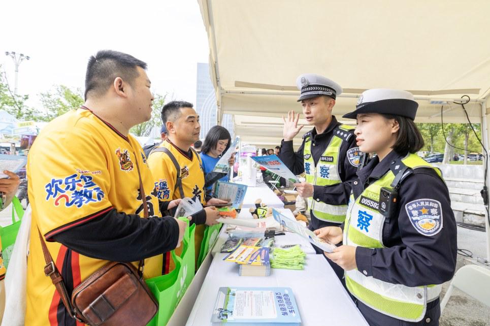随着球迷陆续抵达,现场也逐渐热闹起来。市公安局交通管理支队宣传民警早早来到奥体中心北广场,利用球迷进场时机宣传交通安全知识,让球迷朋友牢固树立交通安全意识,开心而来、平安而归。