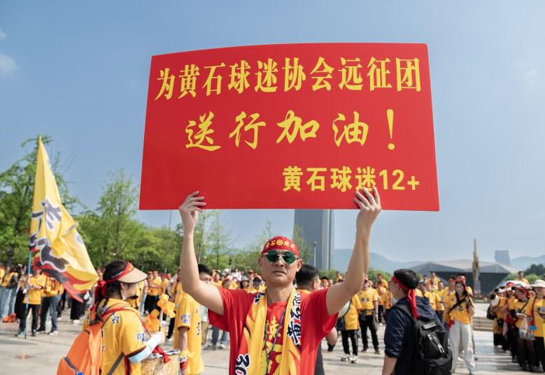 当日下午5时10分许,黄冈市体育中心外,800多名黄石球迷身着统一的黄色球迷服,组成整齐的方阵开始巡游。“同饮一江水,黄黄一家亲!黄冈队,加油!”响亮整齐的口号响起,不少路过的黄冈市民纷纷停下脚步,拿出手机记录下这支“黄色方阵”带来的震撼场面。