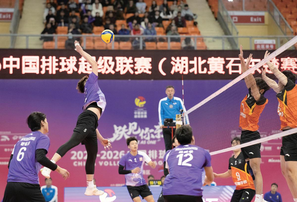 29日晚,在黄石体育馆举行的2025- 2026赛季中国排球超级联赛中,湖北黄石东楚队(紫衣)经过五局激战,以3:2战胜云南滇池学院队,这也是黄石东楚队本赛季主场的收官之战。