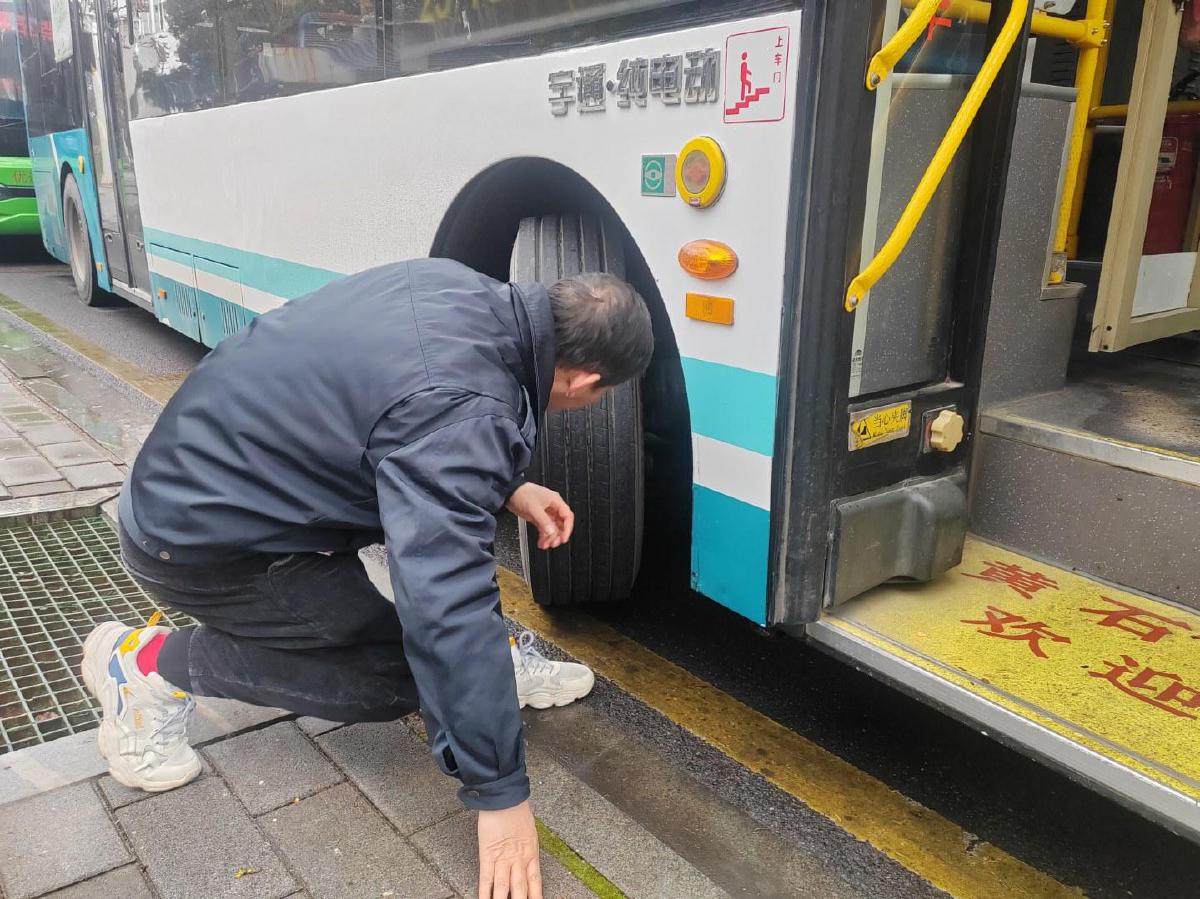 公交集团工作人员在检查公交车车胎