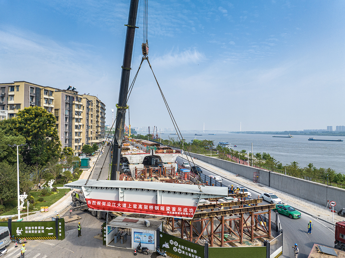 26日上午9时许,由中交二航局承建的黄石大道上窑高架桥项目进行第一联首节钢箱梁吊装施工。上窑高架桥项目是黄石城区长江段岸线综合整治工程项目的重要组成部分。高架桥全长910米,预计10月底完成钢箱梁安装。