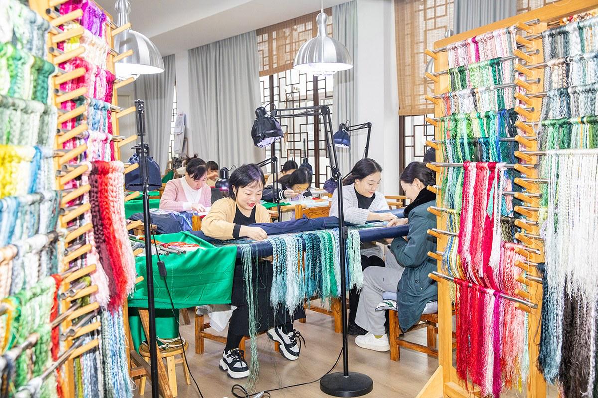 19日,大冶市刘小红刺绣艺术馆,绣娘在赶制绣品订单。该市探索“非遗+产业”的乡村振兴路径,依托“大冶小红绣娘”劳务品牌,培育相关市场,通过刺绣实现妇女创业就业、增收致富。 记者 周巍 摄