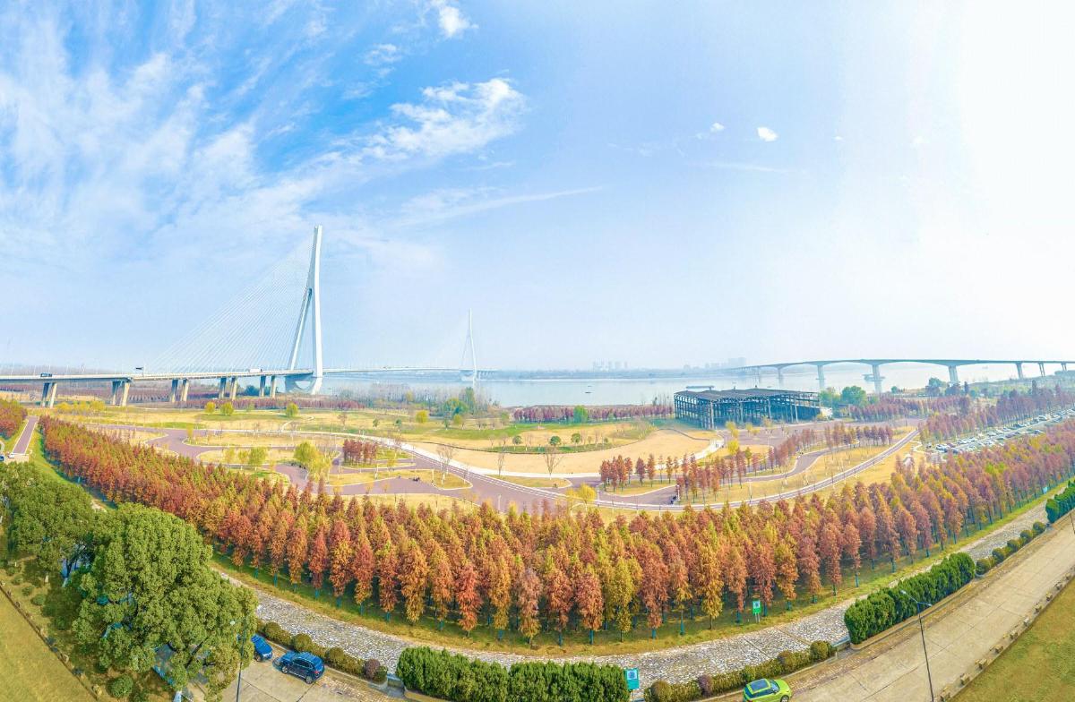 11日,鄂东长江大桥江滩公园的水杉林层林尽染,迎来最佳观赏期。从空中俯瞰,挺拔的水杉与蜿蜒的道路交相辉映,构成一幅色彩斑斓的生态画卷。 记者 李航 摄