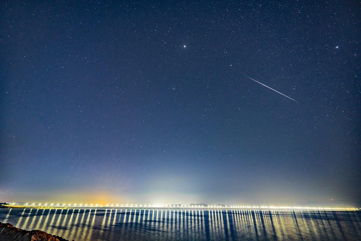 14日晚,双子座流星雨迎来极大期。图为记者当晚在黄石大冶湖北岸拍摄到的流星雨景象。双子座流星雨与象限仪座流星雨、英仙座流星雨并称为北半球三大流星雨。