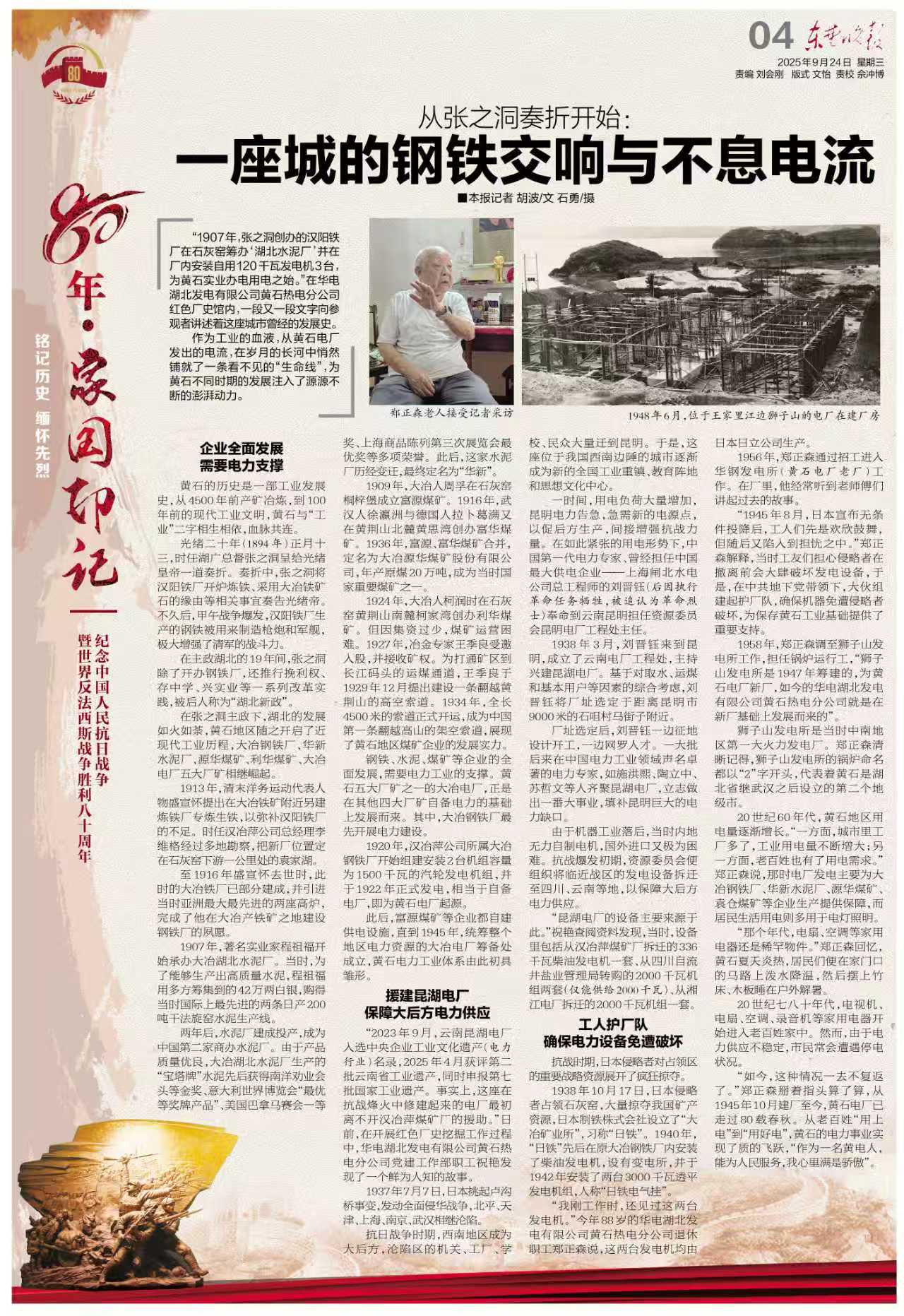 “1945年8月,日本宣布无条件投降后,工人们先是欢欣鼓舞,但随后又陷入到担忧之中。”郑正森解释,当时工友们担心侵略者在撤离前会大肆破坏发电设备,于是,在中共地下党带领下,大伙组建起护厂队,确保机器免遭侵略者破坏,为保存黄石工业基础提供了重要支持。