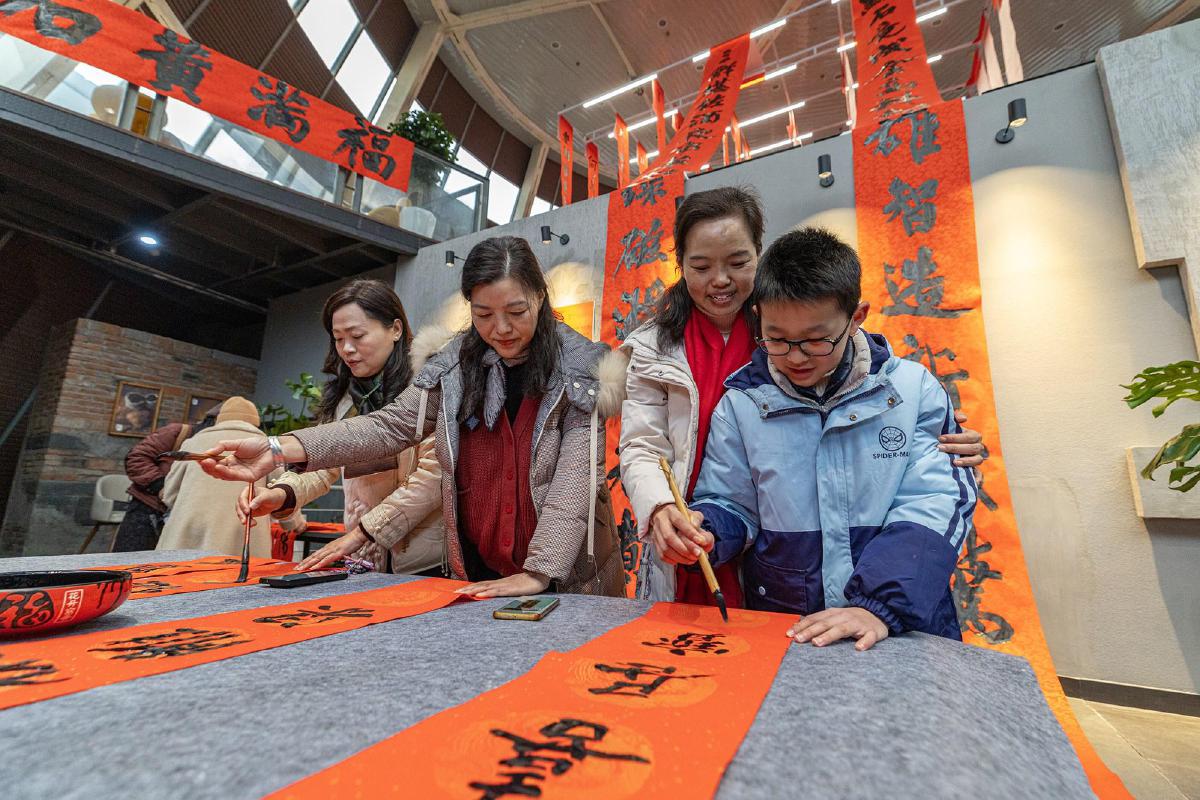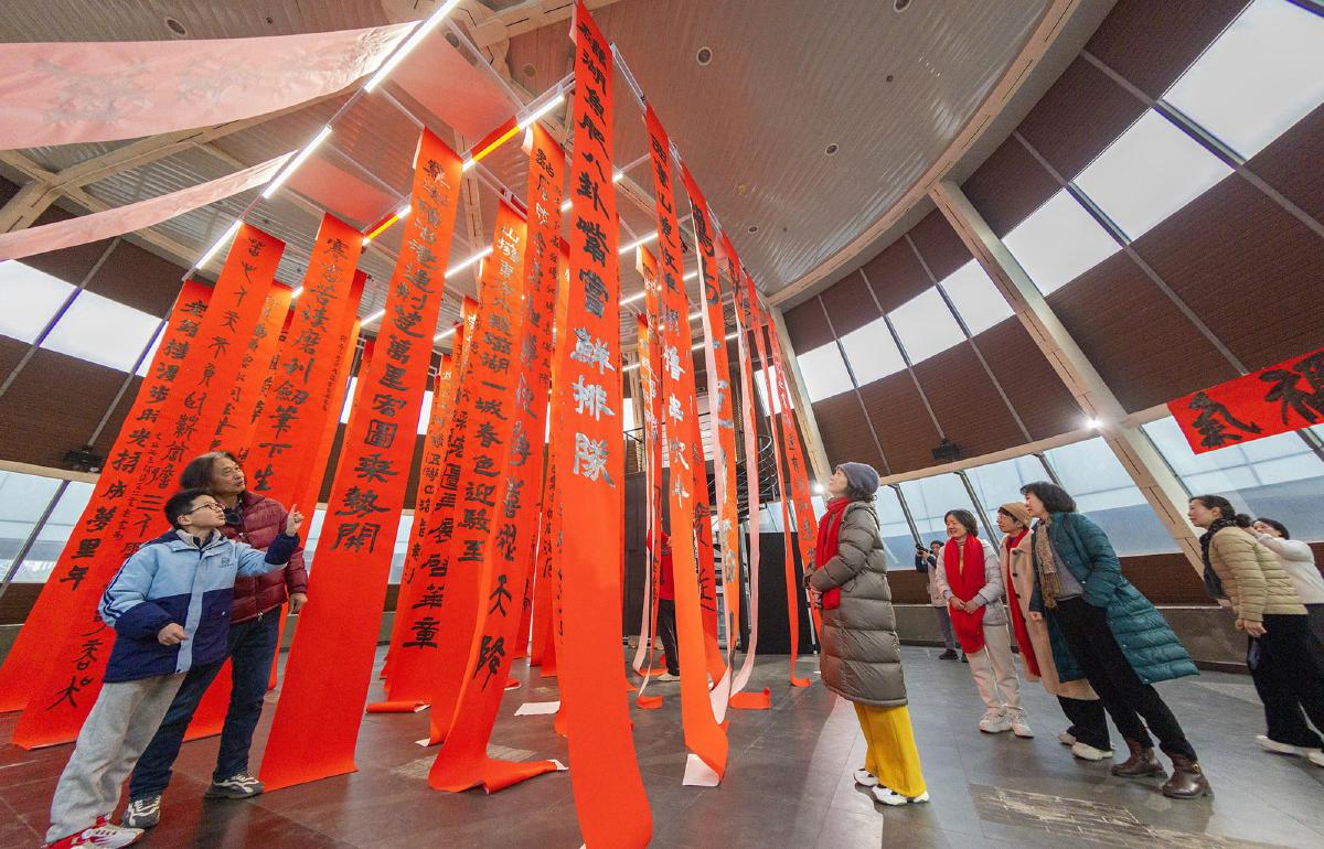 10日,黄石市首届巨幅春联展在市融媒体中心开展,市民在巨幅春联前打卡拍照。据了解,本次展览由市融媒体中心何戈摄影工作室联合湖北理工学院吴永斌书法工作室共同举办,邀请书法爱好者书写6-13.8米长的巨幅春联,融书法之美与光影之妙,传递新春祝福。 (黄石融媒记者 周巍 摄)