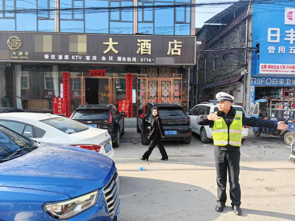 每逢春节前夕,龙港街、星潭街等核心路段的车流、人流迎来了高峰期,周边村民纷纷来此购物、休闲,这就会导致龙港街的路面上有些拥堵。阳新县公安局交通管理大队二中队副中队长方洋一早就来到了路面上,疏导交通,劝离主干道上影响通行的违停车辆,保持龙港街的道路通畅。