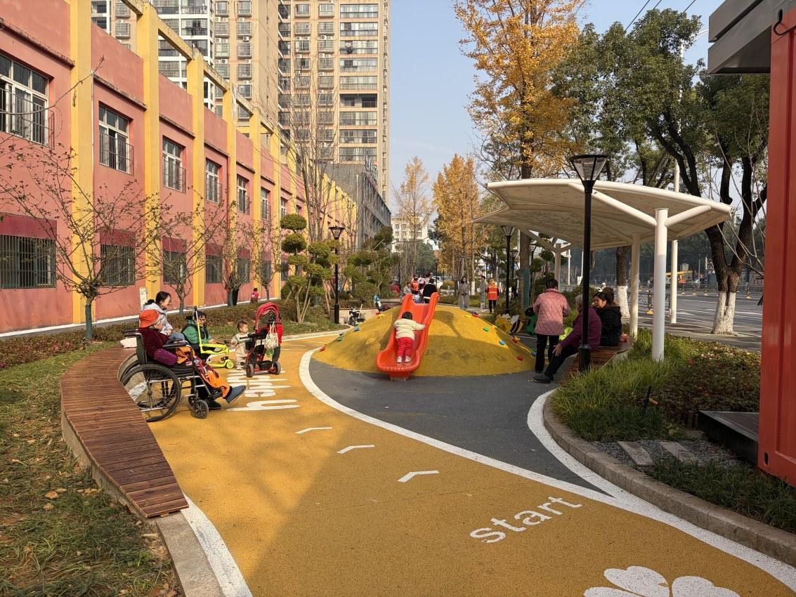 记者在现场看到,这片占地1300余平方米的“社区客厅”,前身是大泉路沿线拆迁腾退后的闲置地块,曾因植被稀疏、杂乱无章被居民“忽略”。如今,循着“留白增绿、拆违建绿”的城市更新理念,这里完成了华丽蝶变:美国红枫、山樱花、金宝石冬青等新栽苗木与原生银杏树相映成趣,红橙黄绿交织出“三季有花、四季有景”的生态画卷;儿童活动区、运动健身区、便民驿站错落分布,滑梯、摇摇马、漫步机等设施一应俱全,精准满足了不同年龄段居民的休闲需求。