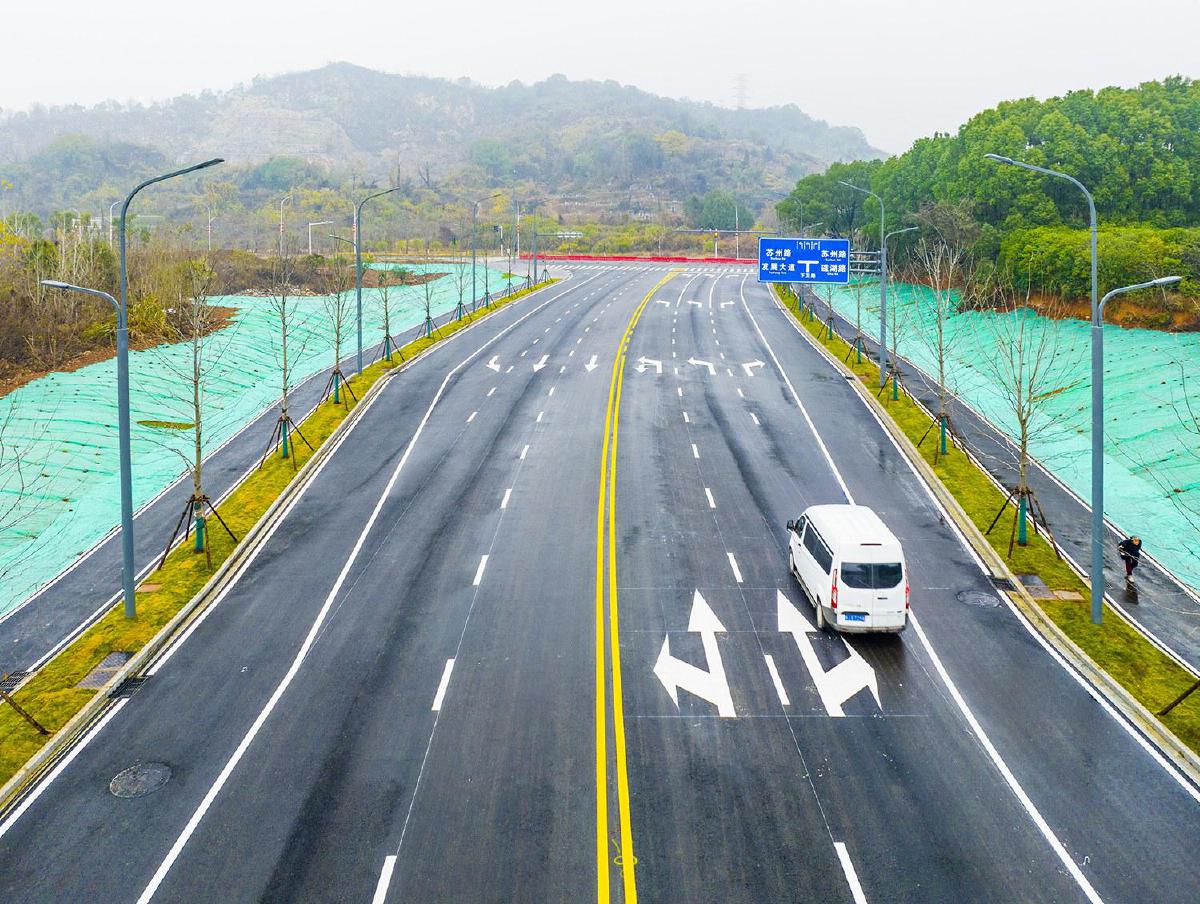 为打造道路景观效果,项目在我市首次采用娜塔栎作为行道树,娜塔栎的主干笔直高大、树冠呈塔状,非常美观,是优良的彩叶树种;该项目段全线安装宽边承插式井盖,实现雨污分流收集,并为周边后续开发地块预留了雨污分流口。施工方还在道路两侧裸露地带种植草坪约4万平方米,营造起绿意盎然的生态景观,可供周边市民休闲。项目全线实现人行道到边到角路面铺装,做到沿线强弱电管线全部入地,并设置了“多杆合一”的智慧路灯99盏,让城市街面变得更为清爽利落。