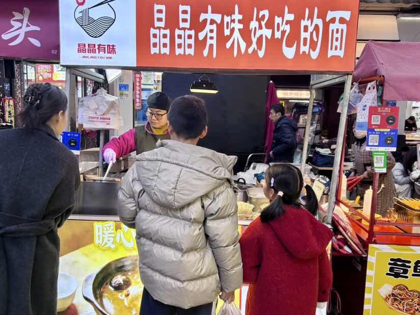 记者看到,余晶的“晶晶有味好吃的面”摊,收拾得干干净净,玻璃盖擦得透亮,她始终戴着手套操作,抓面、煮面、配料都干净利落。夏天卖手撕鸡,冬天主打炸酱面和“心灵鸡汤面”,用的都是李锦记调料,诚意满满,每天能卖出四五十碗。熟客王女士穿着居家服就来报到,她熟练地添加小咸菜,一边拌面一边说:“这面裹满酱汁,小料味道地道,我住附近,这一个月里隔三差五就下来吃一碗。”