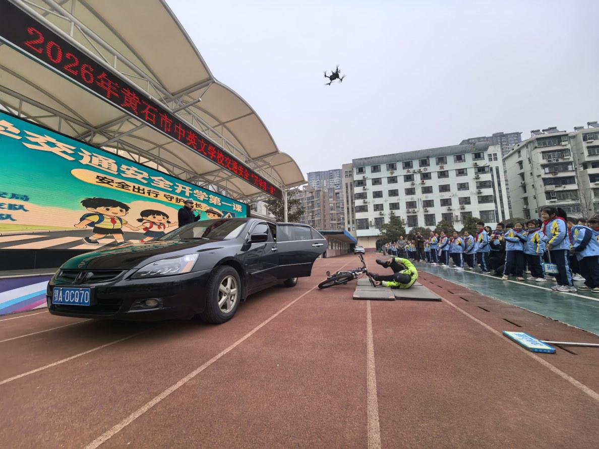 在黄石市中英文学校开学典礼上,黄石市公安局交通管理支队黄石港大队开展交通安全“开学第一课”,将汽车直接开到运动场,通过演示“开门杀”“鬼探头”等易发事故场景,提醒学生注意出行安全。
