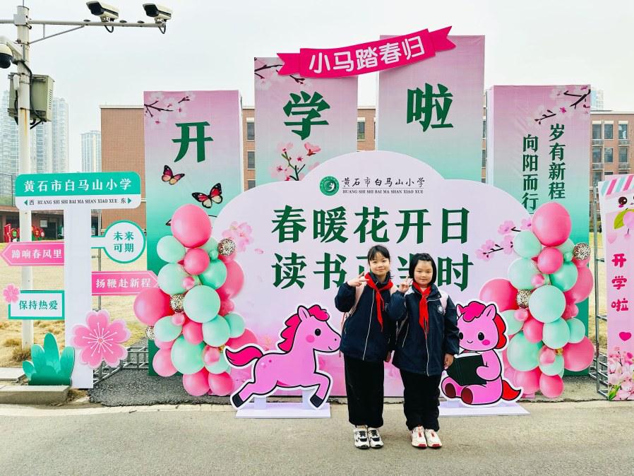 老虎头小学以“春启新程,萌娃归来”为主题,在校园入口处摆放可爱的小马玩偶,成为开学首日的“网红打卡点”。中窑小学的校园里挂满“身体棒棒”“好运连连”“柿柿如意”“福气满满”的祝福标语,孩子们手牵手,在小马玩偶的陪伴下,许下新学期心愿。白马山小学精心打造“蹄响春风里 扬鞭赴新程”主题场景,为每位同学准备了福气书签与甜蜜的棒棒糖,让孩子们感受新学期的美好期许。