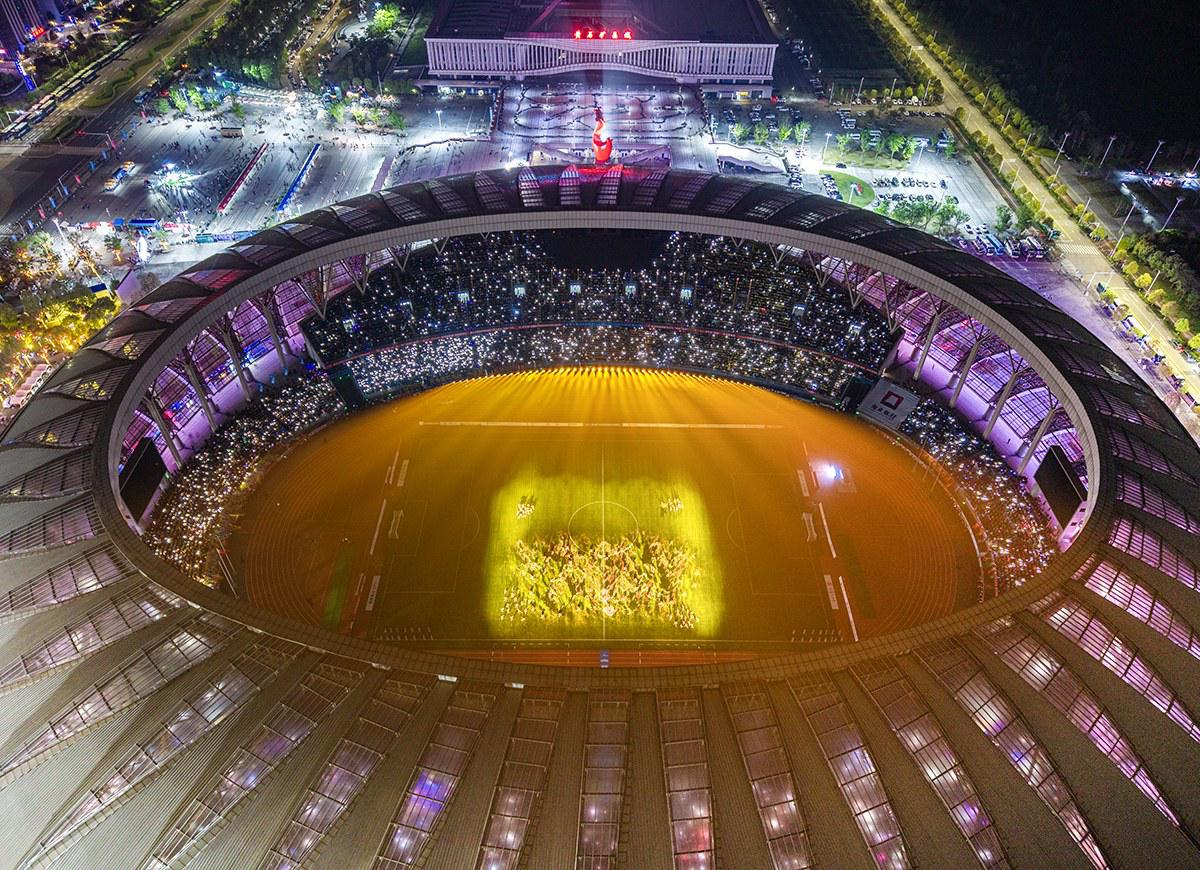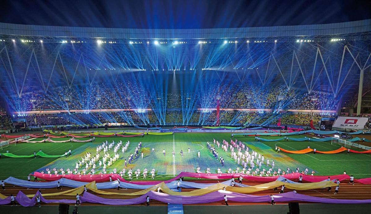 当晚,黄石奥体中心华灯璀璨、人声鼎沸。赛前暖场环节,由“城市发展”“历史文化”“文明新城”“体育运动”四大主题方阵组成的NPC巡游队伍,进行了巡游展演,提前点燃现场气氛。随后的文艺表演,融合了时代、足球、文化、科技与地域五大特色。首篇舞蹈《熔铸》通过灯光秀、裸眼3D效果,营造山脉、铜草花、炉火等环境及场景元素,再融入舞蹈动作,呈现开山寻矿、冶炼铸鼎的劳动场景。第二章情景表演《相逢之山水有约》和《相逢之激情绿茵》兼具视觉震撼与文化厚度,以跨越时空的对话为情感脉络,让当代人物与张志和、苏东坡、张之洞等历史先贤隔空对话,诉说城市文脉传承、赓续地域人文底蕴。并利用裸眼3D效果将湖北省地图呈现于球场上,各市州代表队以“一旗三人一IP”的形式组团进场,展示城市特色元素。第三章歌舞表演《逐梦》,现场演绎本届“楚超”会歌《足梦湖北》,17条巨型彩绸自观众席奔腾而下,汇聚成浩荡的长江意象舞动全场,寓意全省17城同心聚力、共赴盛会,凸显万民欢乐、全民参与的体育精神,将开幕式气氛推向最高潮。