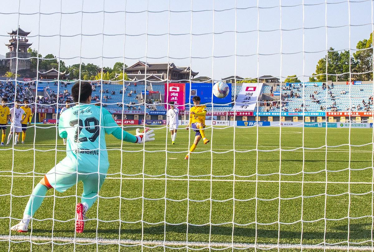 仅仅3分钟后,黄焱祥再度发威。第32分钟,他接队友传切配合后于禁区外拔脚怒射,皮球划出弧线飞入网窝,梅开二度,将比分扩大为2比0。第37分钟,曾在“楚超”揭幕战中为黄石队建功的11号球员童威,禁区内冷静施射破门。上半场结束,黄石队以3比0领先。