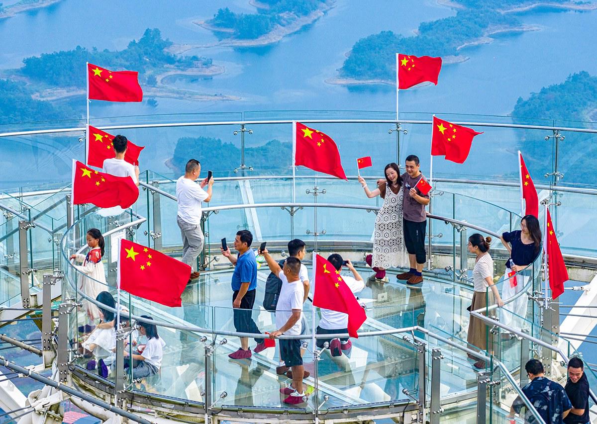 10月1日,阳新县仙岛湖游人如织。在天空之城景区,游客登上天空之镜观景平台打卡拍照,在巨型国旗下留下珍贵影像,来自各地的游客大声合唱《歌唱祖国》,乐享假日美好时光。