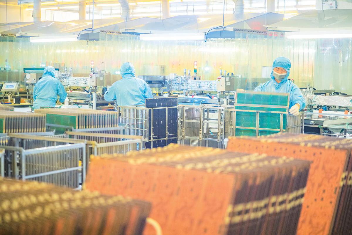 8日,位于开发区·铁山区的超颖电子电路股份有限公司职工在车间作业。该公司生产的毫米波雷达配套供应量居全球第三,液晶面板领域全球占有率达30%,汽车配套领域全球占有率超3%。