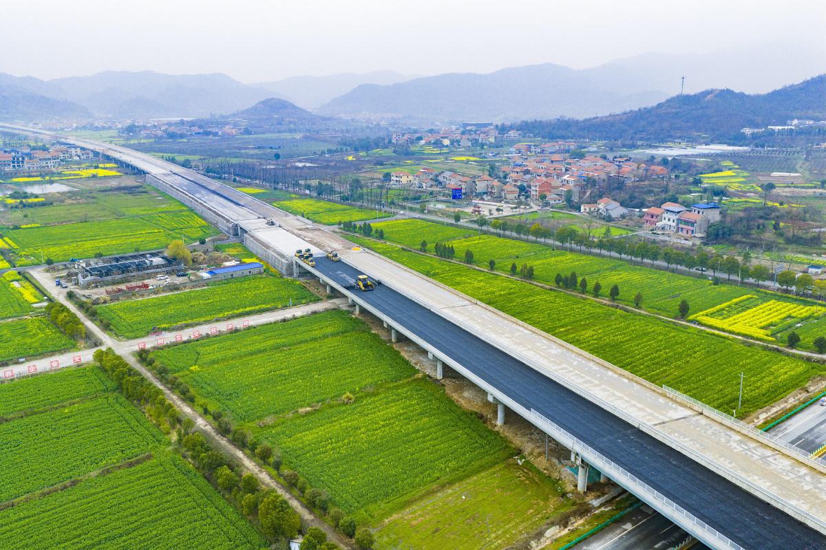 昨日,鄂州机场高速二期大冶段正在进行刷黑作业。
