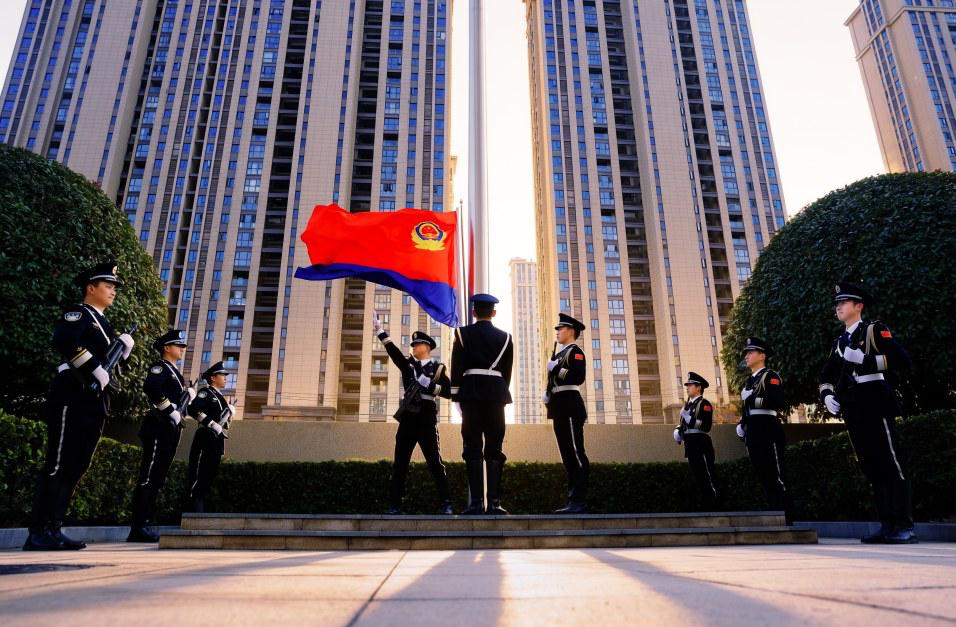 当天上午9时30分,升警旗仪式在市公安局业务技术大楼广场前举行。护旗手高擎警旗正步入场,伴随着雄壮嘹亮的《中国人民警察警歌》,擎旗手挥臂扬旗,警旗迎风升起,全体民警向警旗敬礼。