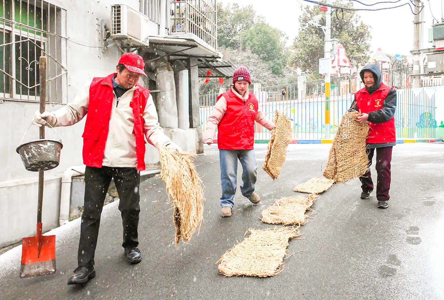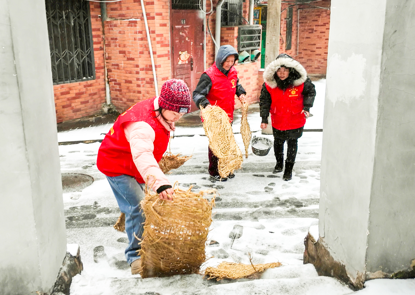 20日,开发区·铁山区建设路社区组织网格“微”管家志愿者铺设草垫,抛洒工业盐,保障居民出行,守护平安。(黄石融媒记者 鄢巍 通讯员 陈瑞 摄)
