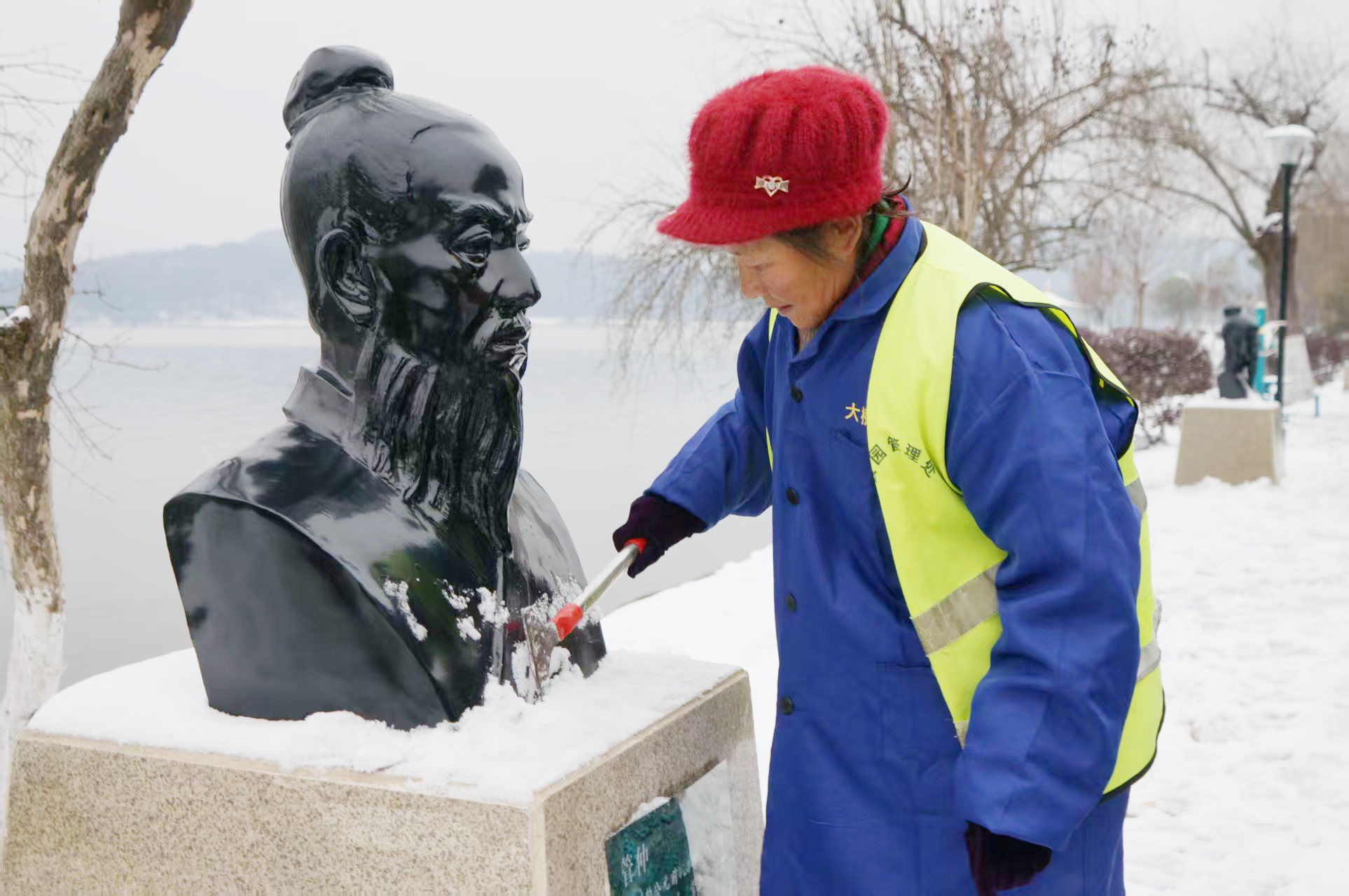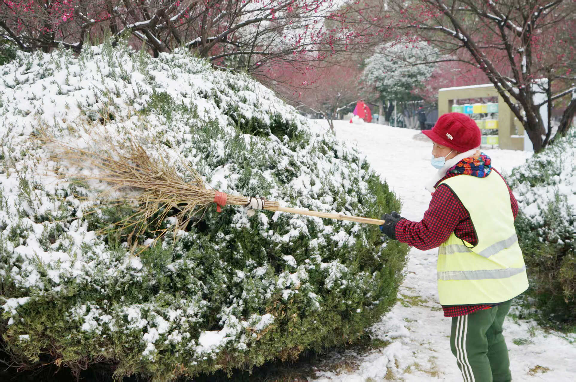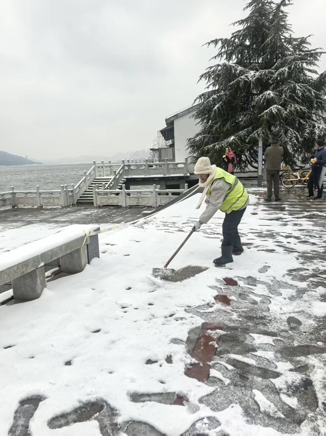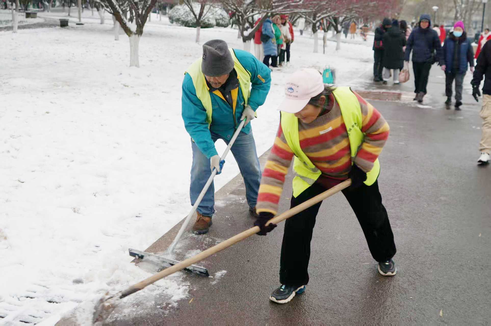 20日黄石市普降大雪之后,黄石市公园广场、主次干道等区域积雪较多,21日气温仍然低至-1℃,部分公园和道路出现结冰路滑现象。两天来,黄石市园林部门累计组织840人,调动42辆车,使用工业盐5吨、草垫5900余个、设置警示标识300余处,采取“除雪—冲洗—撒盐—清理—草垫”的组合方式对公园广场易结冰路段及坡道进行积雪清理,全力保障市民出行安全。(融媒记者 石勇 通讯员 瞿泽敏 摄)