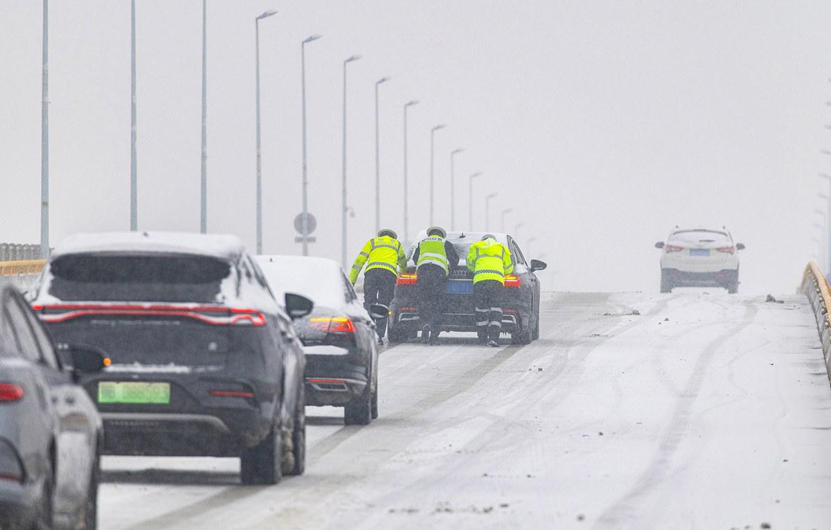20日,在黄石长江公路大桥上,公安交警、交通运输执法人员在风雪中疏导交通,保障过往车辆安全通行。
