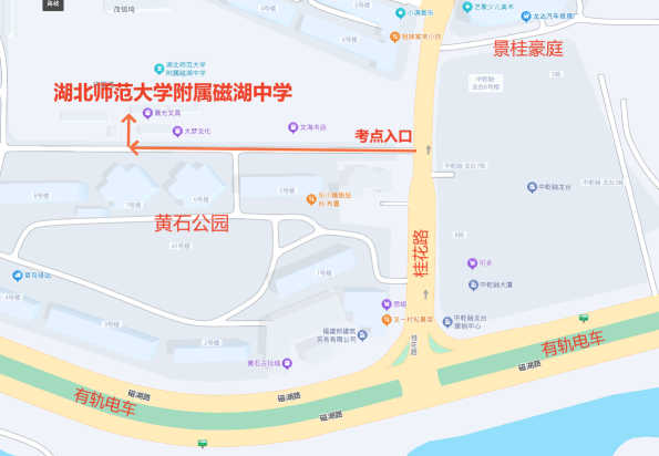 考生可乘坐2路、6路、27路公交车到桂花路南路口站下车,乘坐23路公交车到桂花路南路口站或庙儿咀站下车,也可以选择乘坐现代有轨电车1号线到桂花路磁湖中学站下车,步行至磁湖中学考点。