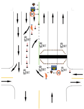 1、第一阶段,使用锥筒封闭一侧道路,另一侧道路使用锥筒进行隔离,设置为双向两车道通行。一侧施工完成后,立即恢复交通,再对另一侧道路进行封闭施工。