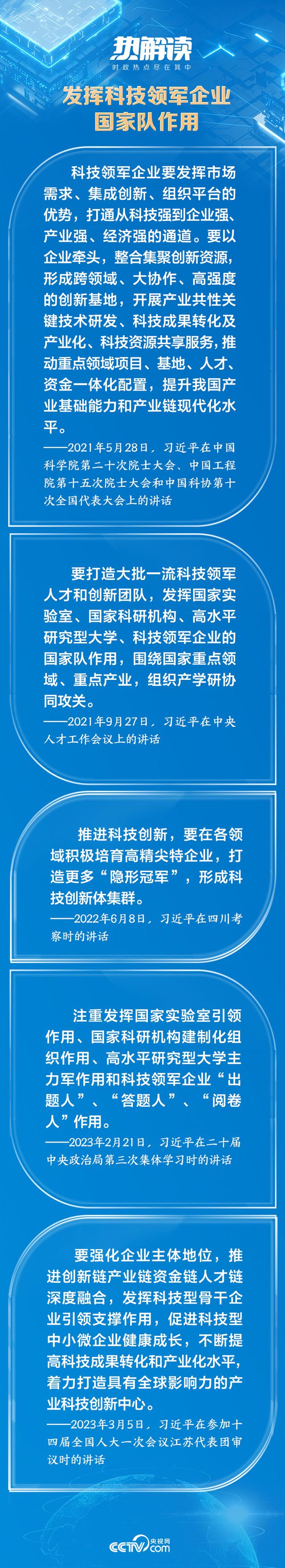 企业是市场的主体,是推动科技创新的生力军。作为国家战略科技力量的重要组成部分,总书记对科技领军企业更是寄予厚望:“要自觉履行高水平科技自立自强的使命担当”,要注重发挥“科技领军企业‘出题人’、‘答题人’、‘阅卷人’作用”。