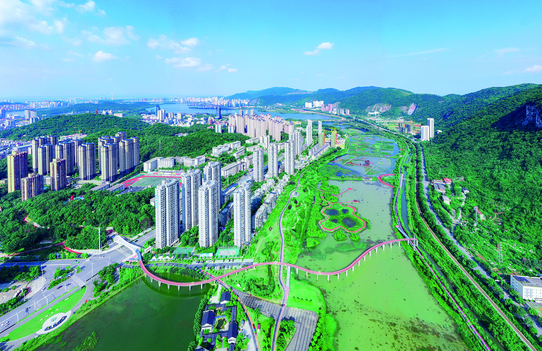 昨日,无人机视角俯瞰磁湖湿地公园和远处黄石城区风光,蓝天白云下,青山绿水间,房屋、道路随山水之势蜿蜒舒展。近年来,我市全面打响蓝天、碧水、净土保卫战,生态环境质量持续改善。