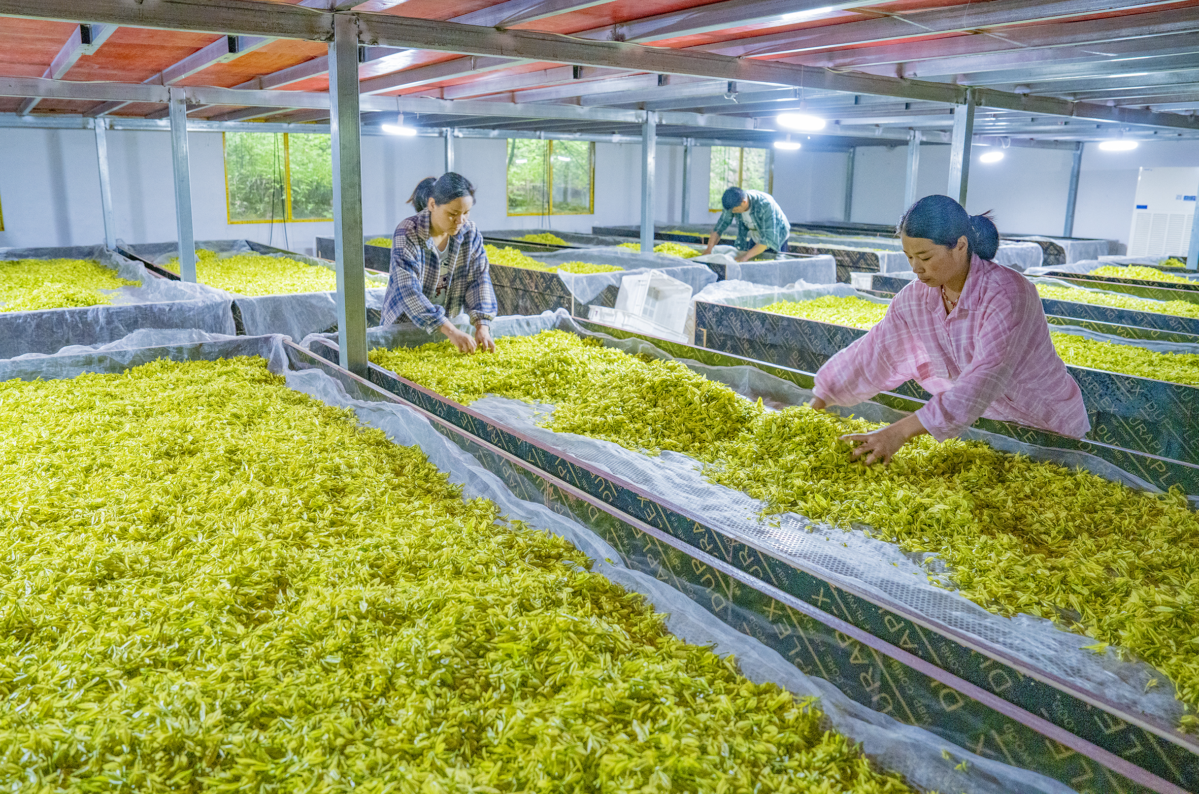 对加工处理,舒道坦同样要求严格。茶农新鲜采摘的茶叶经汇集后,会首先被送至操作车间内进行薄摊,使叶子失去一部分水分;之后,茶叶会经过杀青理条、烘干、风选等处理,以散发青草气,塑造光洁外形,提高鲜爽度,增进茶香。