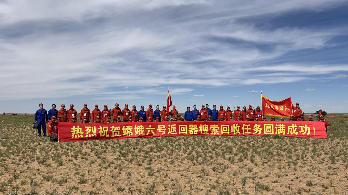 6月25日,搜救队伍在着陆现场庆祝嫦娥六号返回器着陆。新华社发