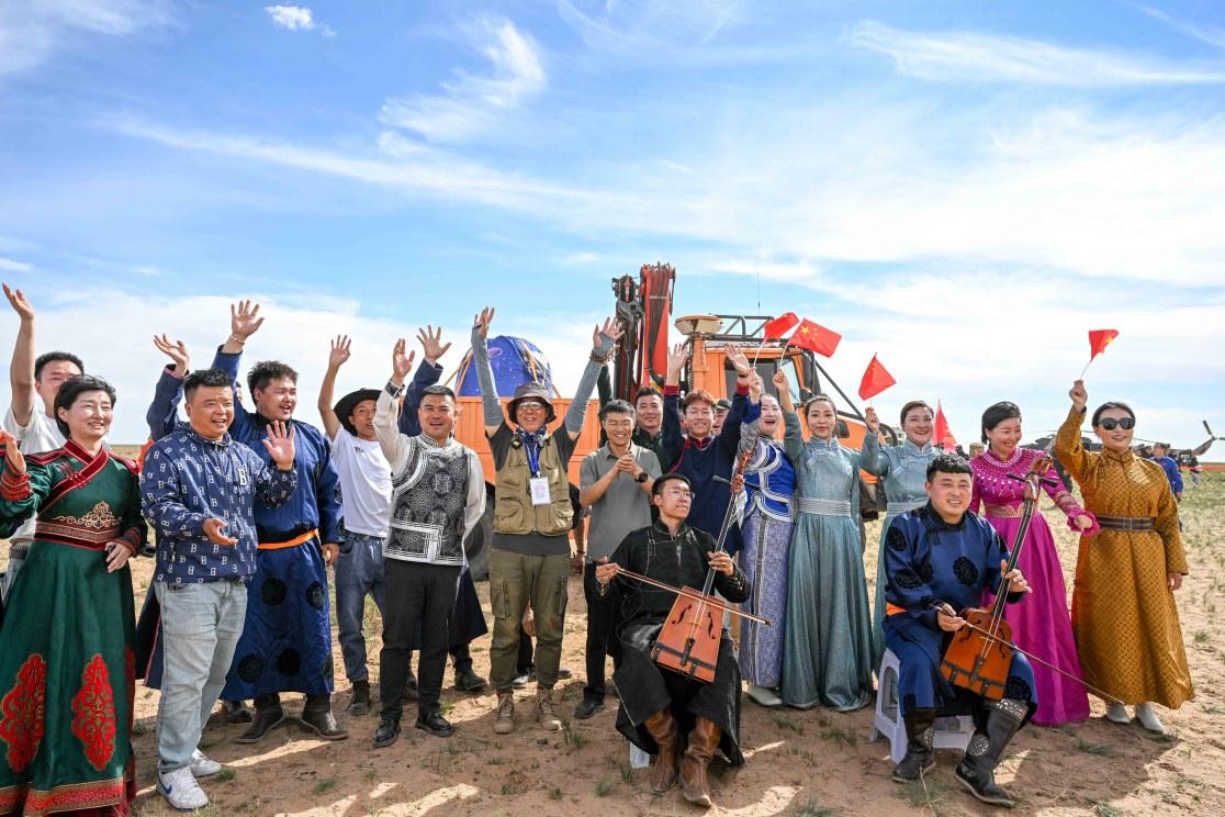 6月25日,四子王旗乌兰牧骑的演员在着陆现场庆祝嫦娥六号返回器着陆。 新华社发