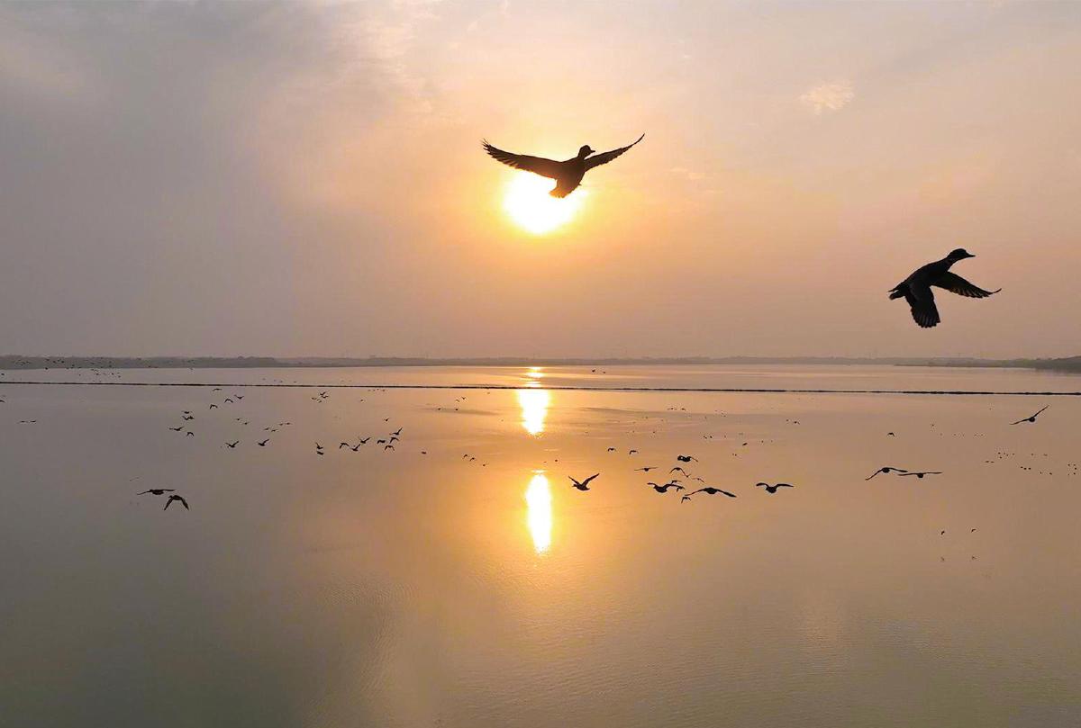 16日,夕阳西下,大冶保安湖的湖面被染上一层金色的光辉,成群的候鸟在天空中盘旋,与晚霞交相辉映,构成一幅宁静而壮丽的自然画卷。这里是候鸟迁徙的重要驿站,成千上万的候鸟在此停歇,为这片湿地增添了无限生机。
