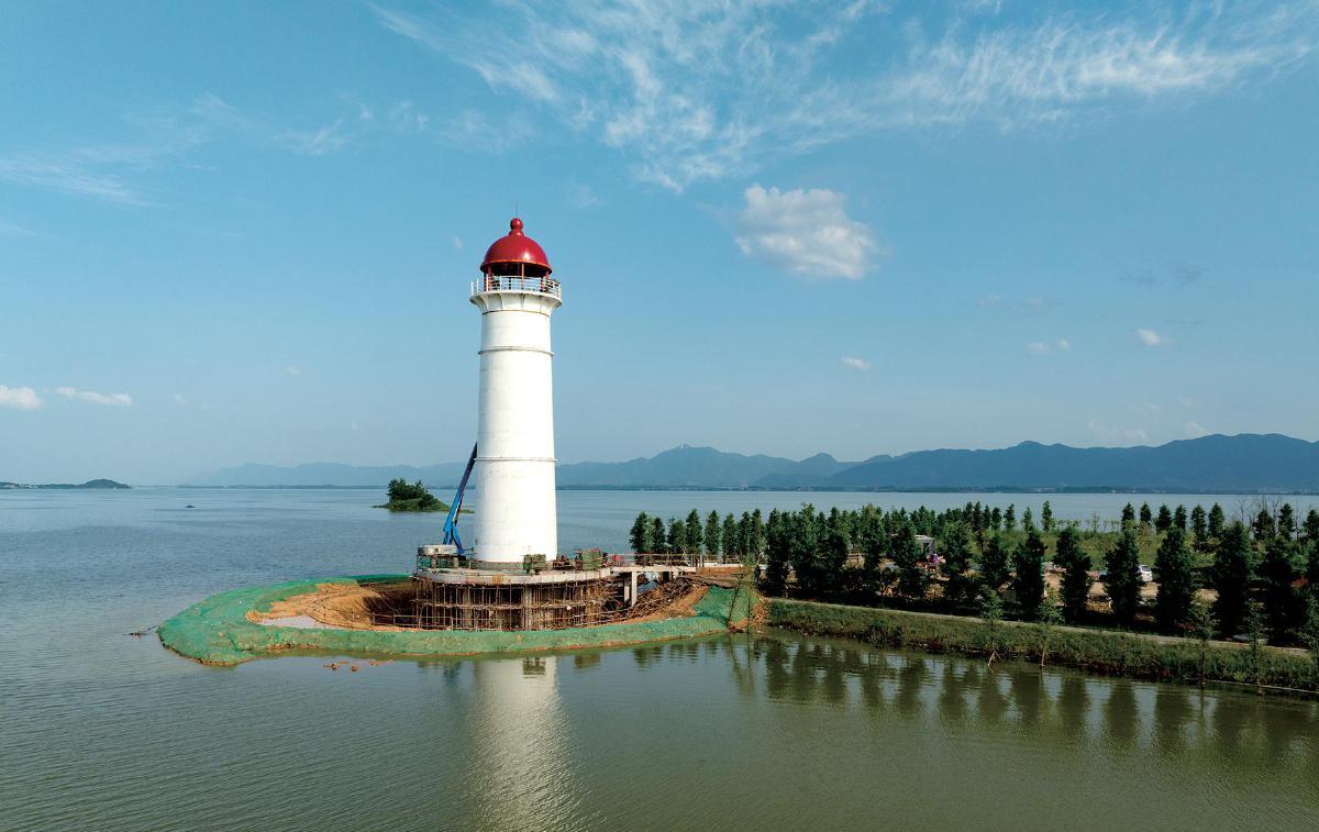 16日,碧水蓝天中即将完工投用的大冶湖绿道灯塔。这座21米高的灯塔位于大冶湖林家湖,建成后将成为检测大冶湖水质的瞭望台,也将成为大冶湖核心区新的文旅地标。
