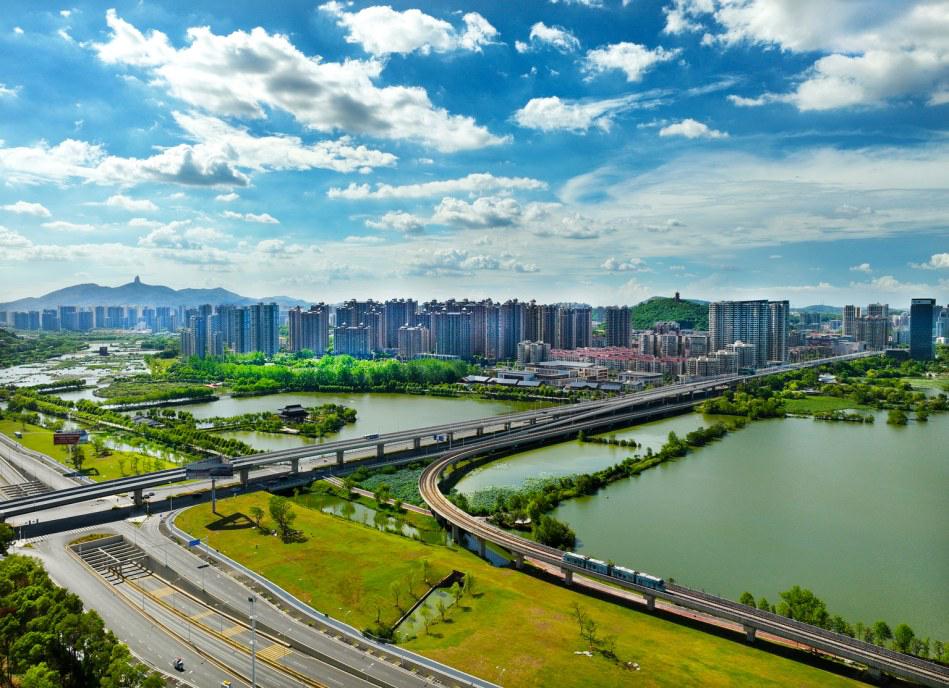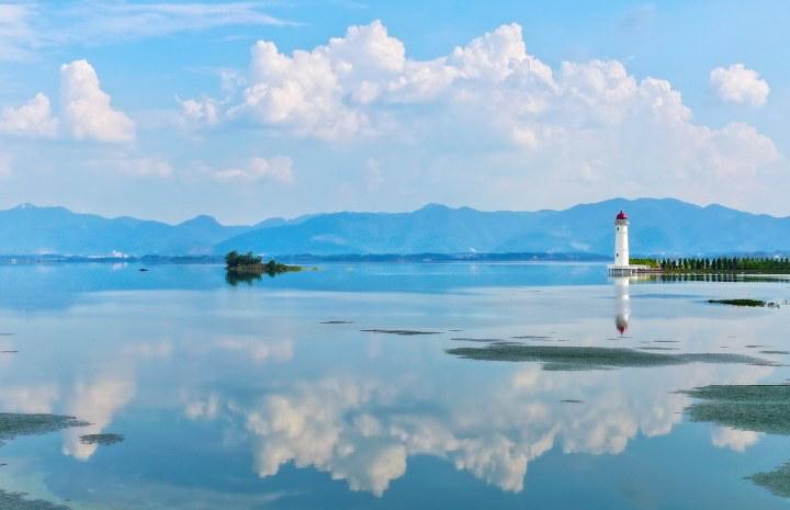 在磁湖、青山湖、大冶湖的潋滟水光之间,一座座桥梁、亭台与灯塔静静伫立。蓝天白云为幕,它们舒展着优雅的身姿,向世人展露灵动与娇媚。