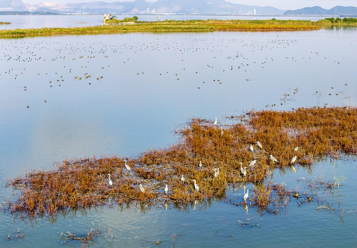16日,网湖湿地自然保护区,候鸟的鸣叫声在湖面上此起彼伏。随着候鸟栖息地的进一步扩大,越来越多的候鸟飞抵网湖越冬。记者 周巍 摄