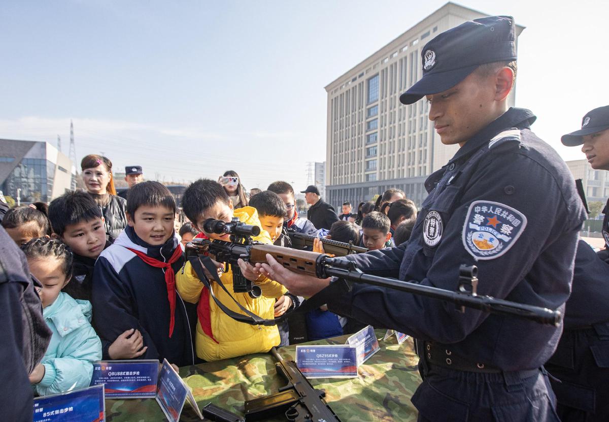 1月9日上午,黄石市公安局警营开放日活动,让前来参观的黄石日报小记者大开眼界。图为孩子们体验狙击步枪。记者周巍 摄 05版