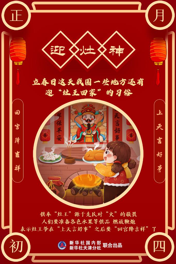 新华社天津2月3日电 2月4日,正月初四,时值立春;巧的是,这一天恰值我国一些地区按照传统习俗,迎“灶王回家”。