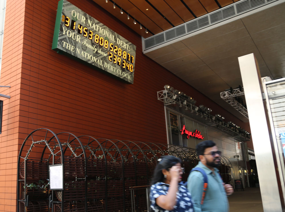 5月29日,人们经过美国纽约曼哈顿的“国债钟”。“国债钟”是一个大型计数器,它实时更新美国的公共债务总额,并显示出每个美国家庭所要负担的数额。新华社记者刘亚南摄