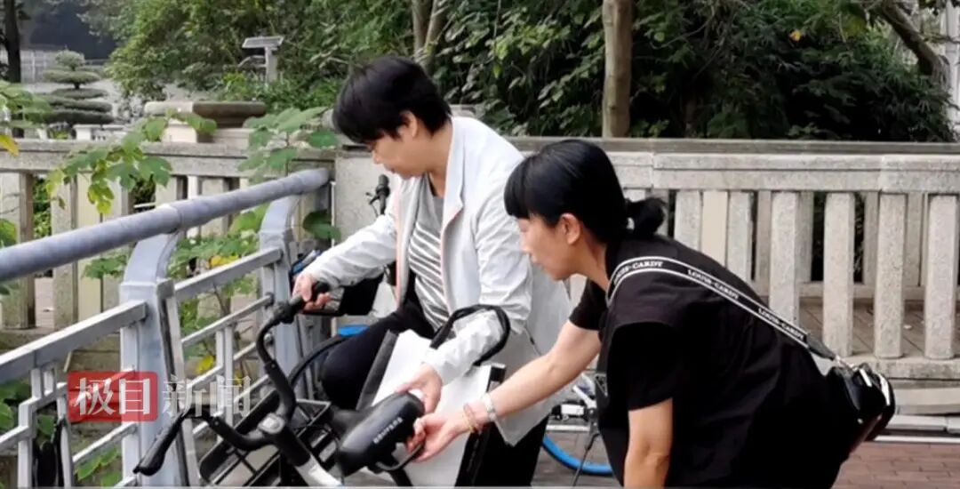 吕明和陈辉(左)在散步时摆正倒地的自行车(受访者供图)