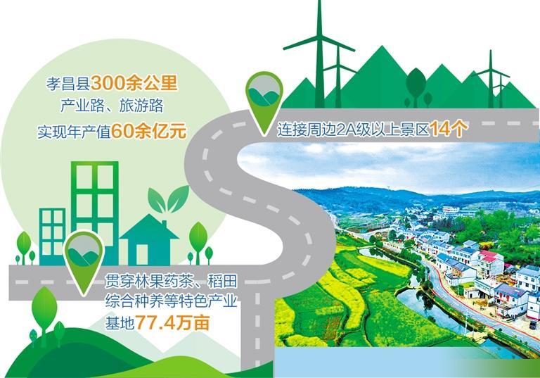 以点带面、以线串珠,孝昌以路网串联起各乡镇特色景点,构建了青山绿水、美丽公路、特色村湾互融互通的全域旅游格局,发挥出“以路带产”“以路促游”良好效益,一大批特色农产品依托“四好农村路”走出山门,王店镇磨山村、小悟乡田堂村、小河镇明清古街成为网红打卡地,游客纷至沓来。目前,孝昌县300余公里产业路、旅游路,贯穿林果药茶、稻田综合种养等特色产业基地77.4万亩,连接周边2A级以上景区14个,实现年产值60余亿元。