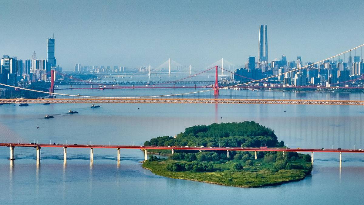 从高空俯瞰长江武汉段,水清岸美,6座跨江大桥尽收眼底。(湖北日报全媒记者 柯皓 摄)