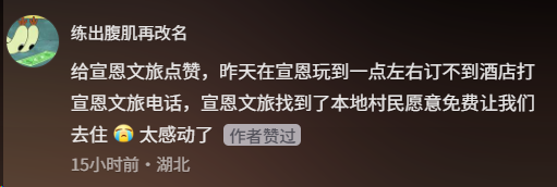 “来的路上,我们在各个平台上看已经没有房间了。然后到了宣恩之后,联系当地的民宿,也都没有房间了,最后是文旅局给我们找的住处,整理得很干净整洁,也很热情,解决了我们的燃眉之急,很感动。”从西安远道而来的游客蒲李星告诉记者,第一次以这样的方式在旅游途中住宿,是一次非常特别的体验,下次还会来湖北。