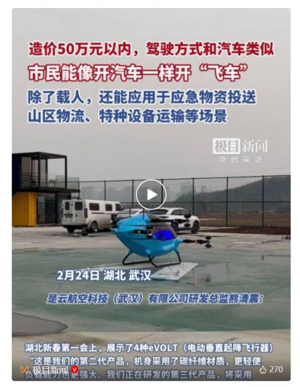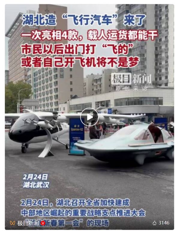 湖北造飞行汽车来了!单价或50万元以内,市民可以像开汽车一样开“飞车”