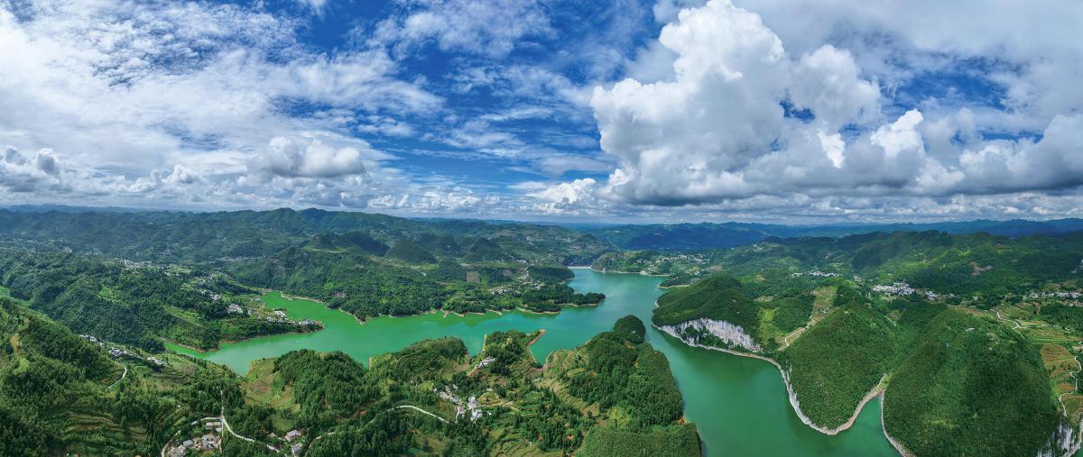 斯拉河地处安顺市平坝区齐伯镇与织金县上坪寨乡交界处,一江碧水蜿蜒,两岸风景叠翠,成了当地水利生态建设成效的生动注脚。